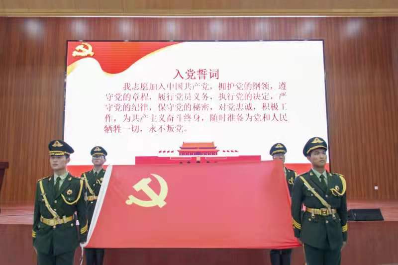 接着,新党员进行入党宣誓。院铁军队员身着戎装,脚踢正步将党旗送入会场。威武雄壮、铿锵有力,体现了入党的庄重性和严肃性。随着党旗的展开,牛青杨领誓,140名新党员举起右手,在党旗的见证下,用响亮的声音宣读入党誓词,表达了他们对党的忠诚和成为一名党员的决心。