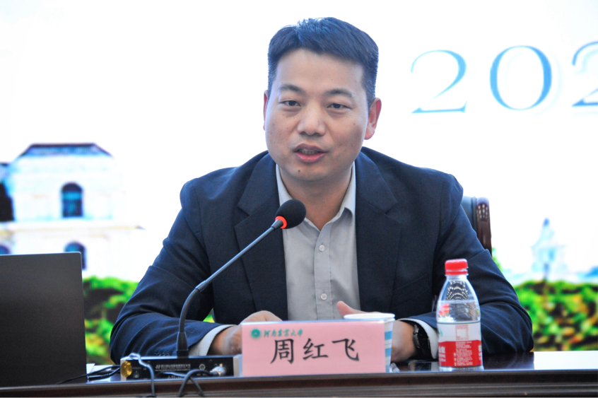讲座伊始,周红飞结合自己作为高校新闻工作者18年来的工作经历,向大家讲述了一个高校新闻人所应具备的素养——热爱和创造,他表示:热爱,才有意义;创造,才有价值。