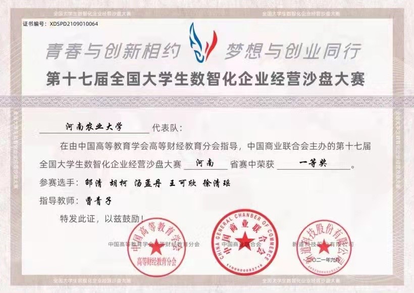 由曹青子老师指导,闵文良、章凡、王愉翔、姚小雨、宋文静同学参加的参赛队荣获河南省赛二等奖。