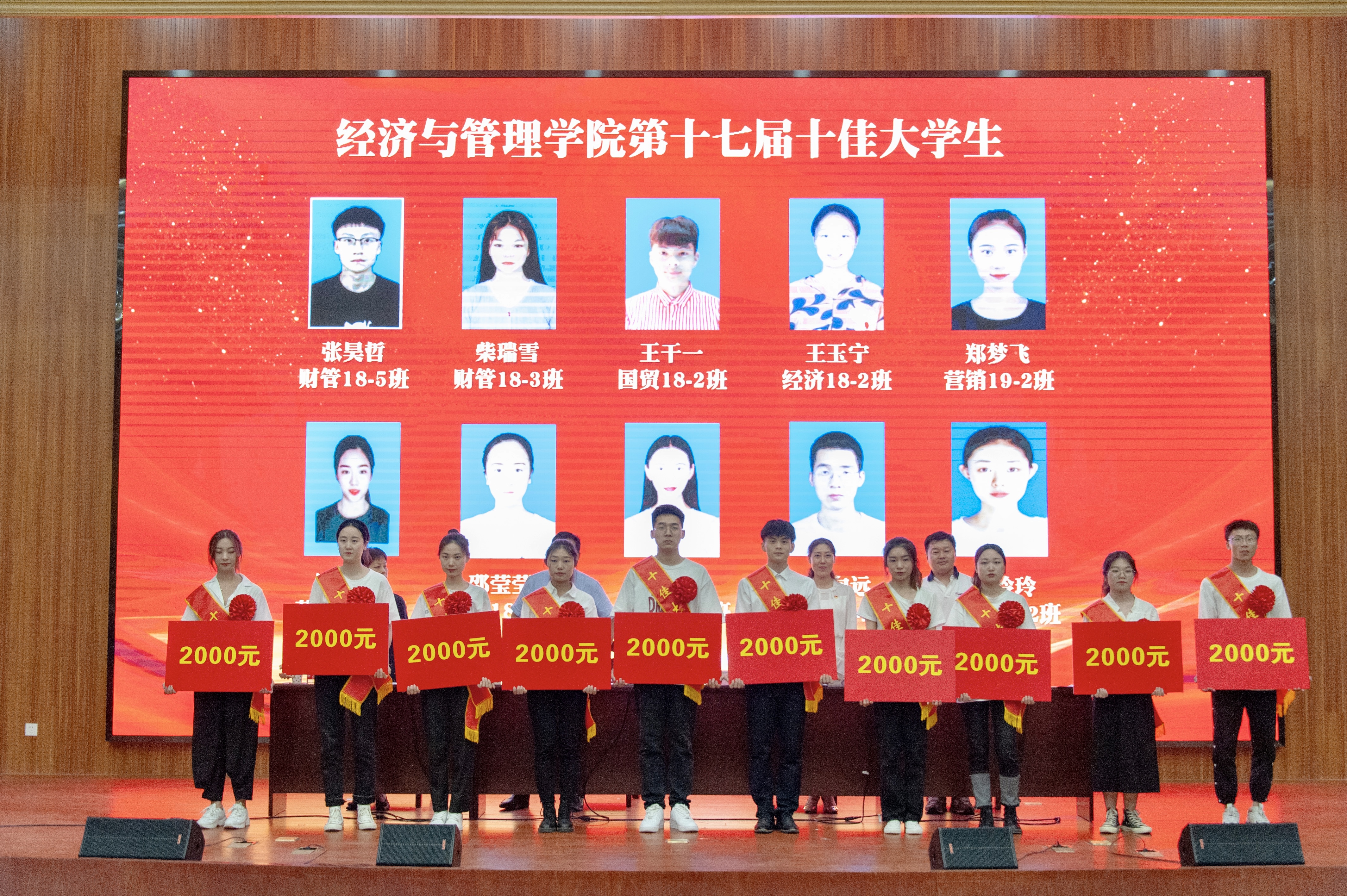 领导为受表彰的先进集体和先进个人颁奖并合影留念。随后,先进班集体代表,校级红旗团支部2018级财务管理3班团支书柴瑞雪、优秀毕业生代表2017级工商管理1班李克鑫和先进个人代表2018级市场营销1班饶惠婷分别上台发言,他们分别讲述了领导班级建设的经验和自我成长变化的历程,表露出要继续努力拼搏、再创辉煌的决心,并对学弟学妹们提出殷切的希望。
