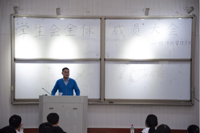 在教学楼大教室5举行学生会全体成员大会。院团委副书记杨鑫出席会议,威尼斯人App