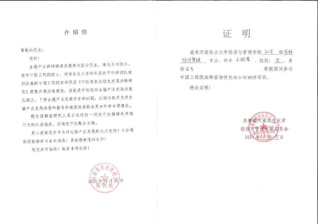 立身以立学为先,立学以读书为本。一进入大学,毛聪慧就告诉自己,学习是学生的天职,无论再怎么拓宽自己的经历,都不可忽视学习。入校以来,她一直勤奋刻苦,努力拼搏,四年来共有25门课程达到90-100分的优秀标准,22门课程达到80-90分的良好标准,共占比85.45%,位列班级第一。她两次获得国家励志奖学金,先后被评为校级学风建设先进个人,院级三好学生、优秀学生干部等。目前已经以专业综评第二的成绩成功推免至东北大学应用经济学专业。课余时间,她考取了英语四、六级证书、企业人力资源管理师证书,普通话证,驾驶证等。同时,她经常参加各种学术竞赛活动,如第七届“互联网+”大赛,负责攥写两份项目计划书的财务部分,一项入围省赛,一项入围校赛。2021年寒假,她作为问卷调研员参与中国工程院战略咨询研究项目《中国畜牧业绿色发展战略研究》调研活动,调研的内容主要为生猪绿色养殖,通过近一周的走访排查,共保质保量独立完成十份调查问卷,调查地点基本设计涉及所在县区全部乡村,覆盖范围全面广泛,皆被成功回收。四年的努力终没被辜负,如今她已经以专业综评第二的成绩成功推免至东北大学应用经济学专业。她期待着在未来读研的日子里,仍然能够像现在一样,认真,踏实,诚恳地对待自己的学习工作,牢记自己的初心,并坚持下去,早日学有所成,奉献社会。
