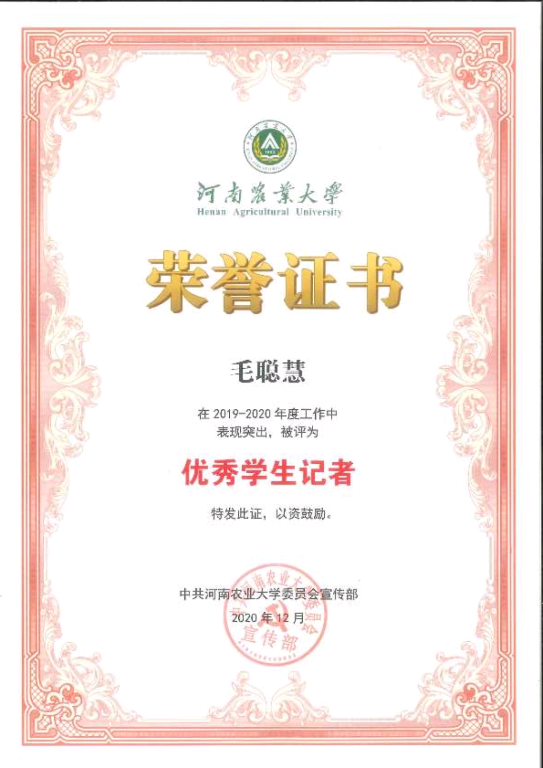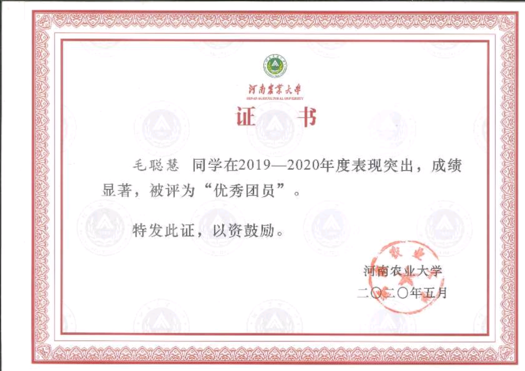 的快闪拍摄,获“院文艺工作先进个人”。除此之外,毛聪慧曾担任第十三届少数民族运动会大学生志愿者。作为优秀学生代表,在2020年9月接受河南卫视关于“返校复工”的采访,在2020级本科新生见面会上进行发言,在威尼斯人App