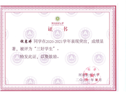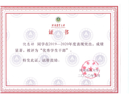暑期社会实践先进个人”。牛顿曾经说过,如果说我看得比别人更远些,那是因为我站在巨人的肩膀上。学思至此,饶惠婷已经接触、见证了不知多少个“巨人”,普通但善良的父母、勤恳负责的老师、优秀又努力的学长学姐、勇于突破的同学、兴趣广泛的朋友等等,都给了她不断向前、不懈奋斗的信心和勇气,他们所传递出的善意,使饶惠婷更加坚定了“万物向阳,爱有力量,要更努力,为心之所向”的决心。未来,她也将走向更高的平台,追寻更优秀的自己。余生很长,慢慢成长。