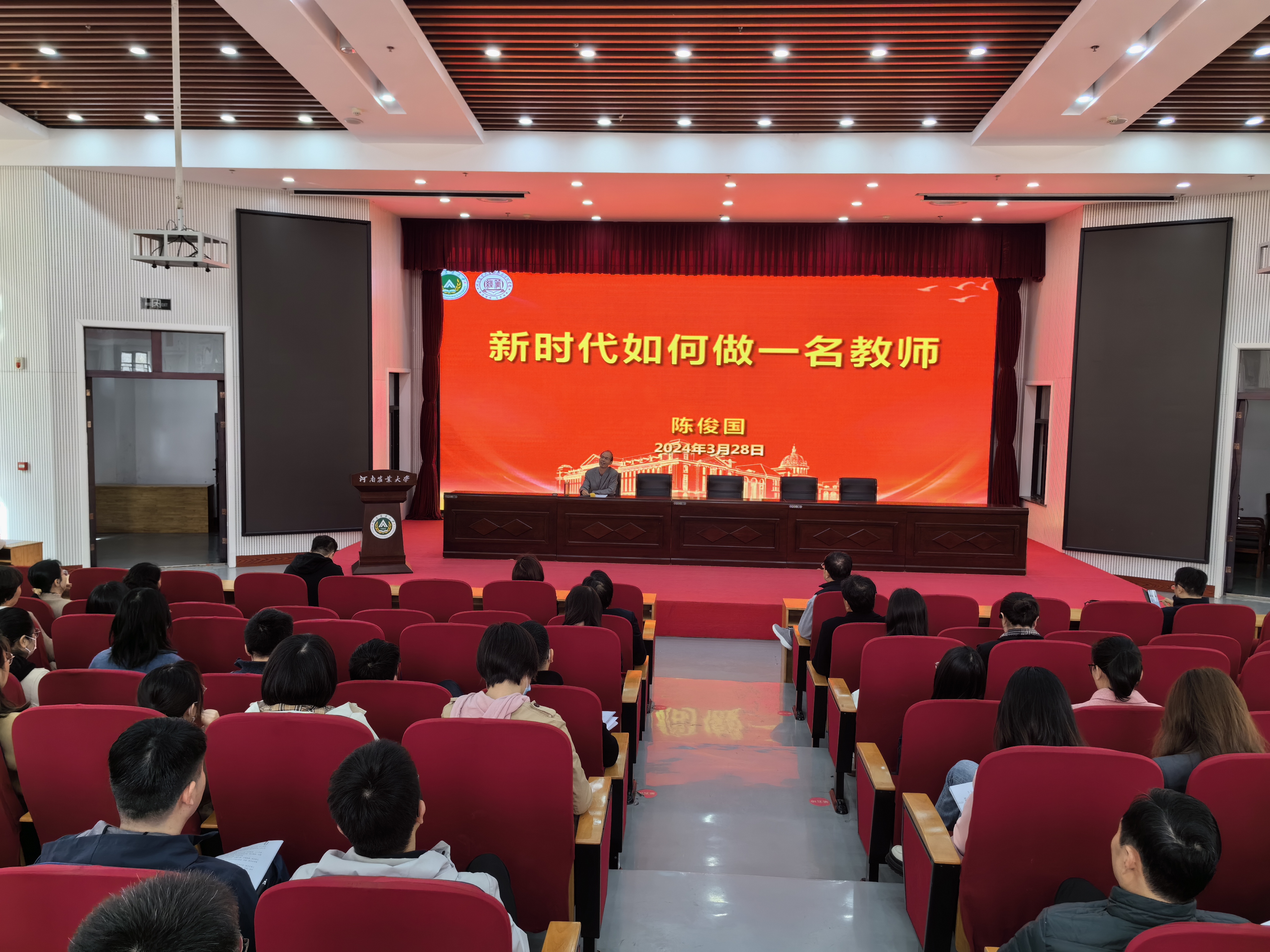 农林经济管理系优秀教师代表陈俊国老师作题为《新时代如何做一名教师》的师德师风专题报告。陈老师从牢记“为党育人,为国育才”初心使命、树立“贴近生活,放眼世界”教学目标、“把握情绪,做更好的自己”等方面号召全体教师加强师德修养,做“四有”好老师。