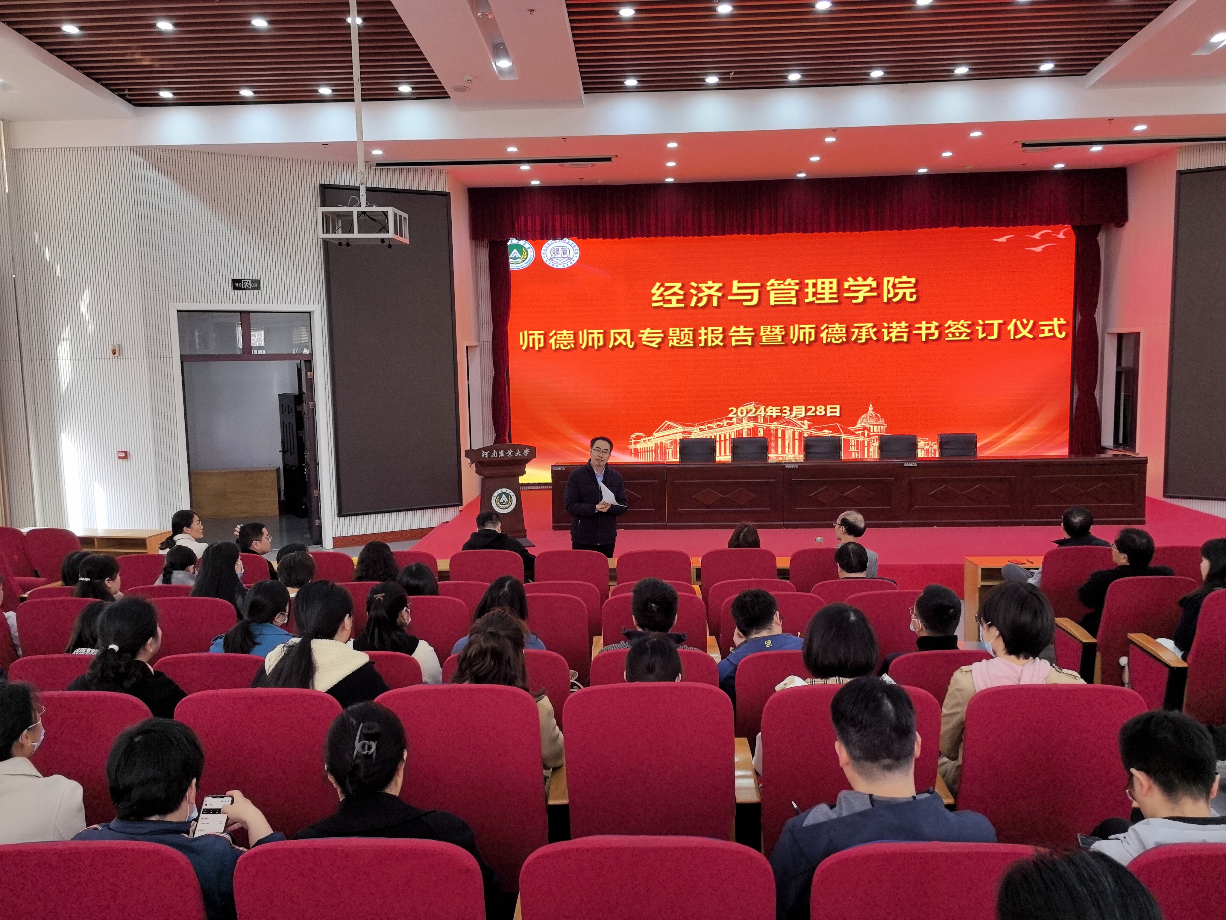 为进一步落实立德树人根本任务,加强威尼斯人App 师德师风建设,营造风清气正的教育环境,3月28日上午,威尼斯人App 在繁塔楼大教室一开展师德师风专题报告暨师德承诺书签订仪式。威尼斯人App 领导班子成员及全体教职工参加会议,会议由院党委书记王宏立主持。