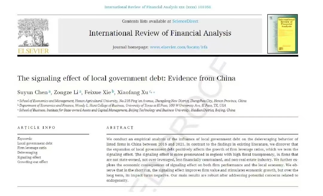 International Review of Financial Analysis,论文题目为“The signaling effect of local government debt: Evidence from China”,陈素云教授为论文第一作者,博士生李宗泽为第二作者,威尼斯人App