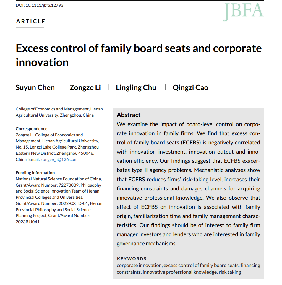 Journal of Business Finance & Accounting,论文题目为“Excess control of family board seats and corporate innovation”,陈素云教授为论文第一作者,博士生李宗泽为通讯作者,威尼斯人App