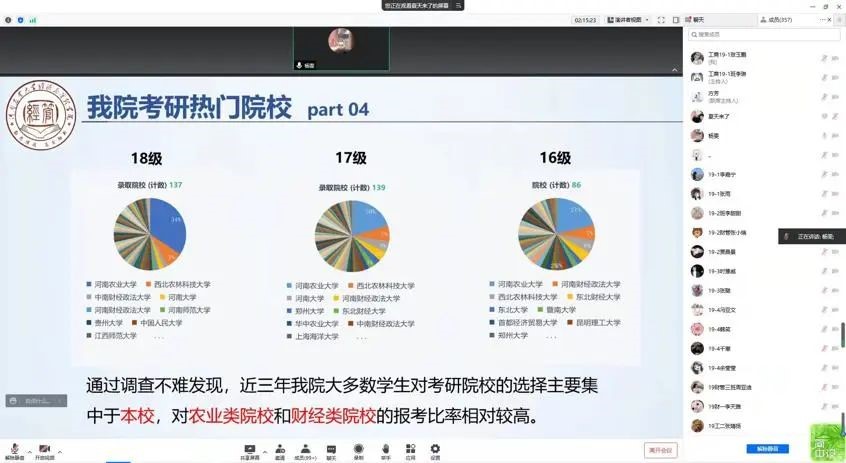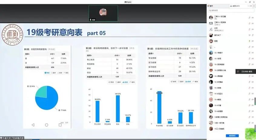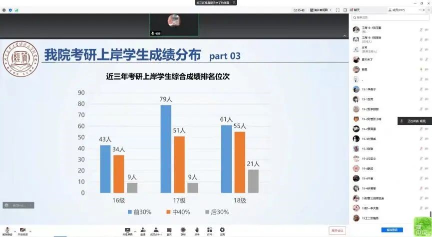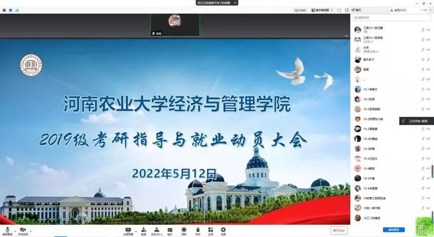 召开2019级本科生考研指导与就业动员线上会议,此次会议由院党委副书记方芳、院团委书记杨鑫主讲,19级辅导员张桂玲主持,两名18级考研成功上岸学生杜文晴、杨雯分享备考经验,19级本科生近400余人积极参加此次会议。