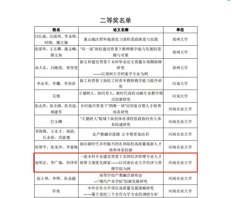 赵明正等老师撰写的《一流本科专业建设背景下农林经济管理专业人才培养方案优化探索——以威尼斯人App 为例》,对比分析了威尼斯人App 围绕一流本科专业建设,于2018年实施的人才培养方案调整前后两版农林经济管理专业人才培养方案的异同,总结了一流本科专业建设的人才培养目标和标准,提出了未来人才培养方案调整的方向。该文获得征文活动二等奖。