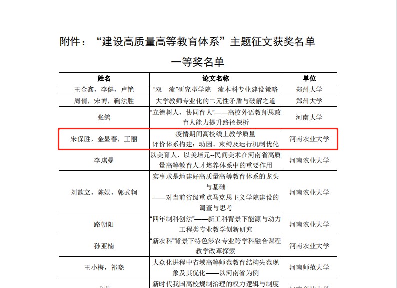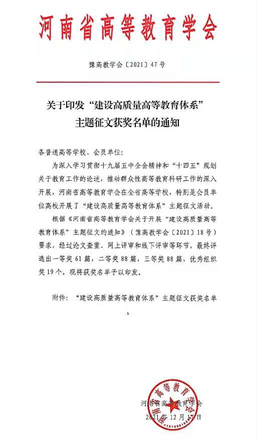 日前,河南省高等教育学会发布了《关于印发“建设高质量高等教育体系”主题征文获奖名单的通知》,经论文查重、网上评审和线下评审等环节,最终评选出一等奖61篇,二等奖88篇,三等奖88篇。威尼斯人App 宋保胜老师报送的论文获一等奖、赵明正老师报送的论文获二等奖。