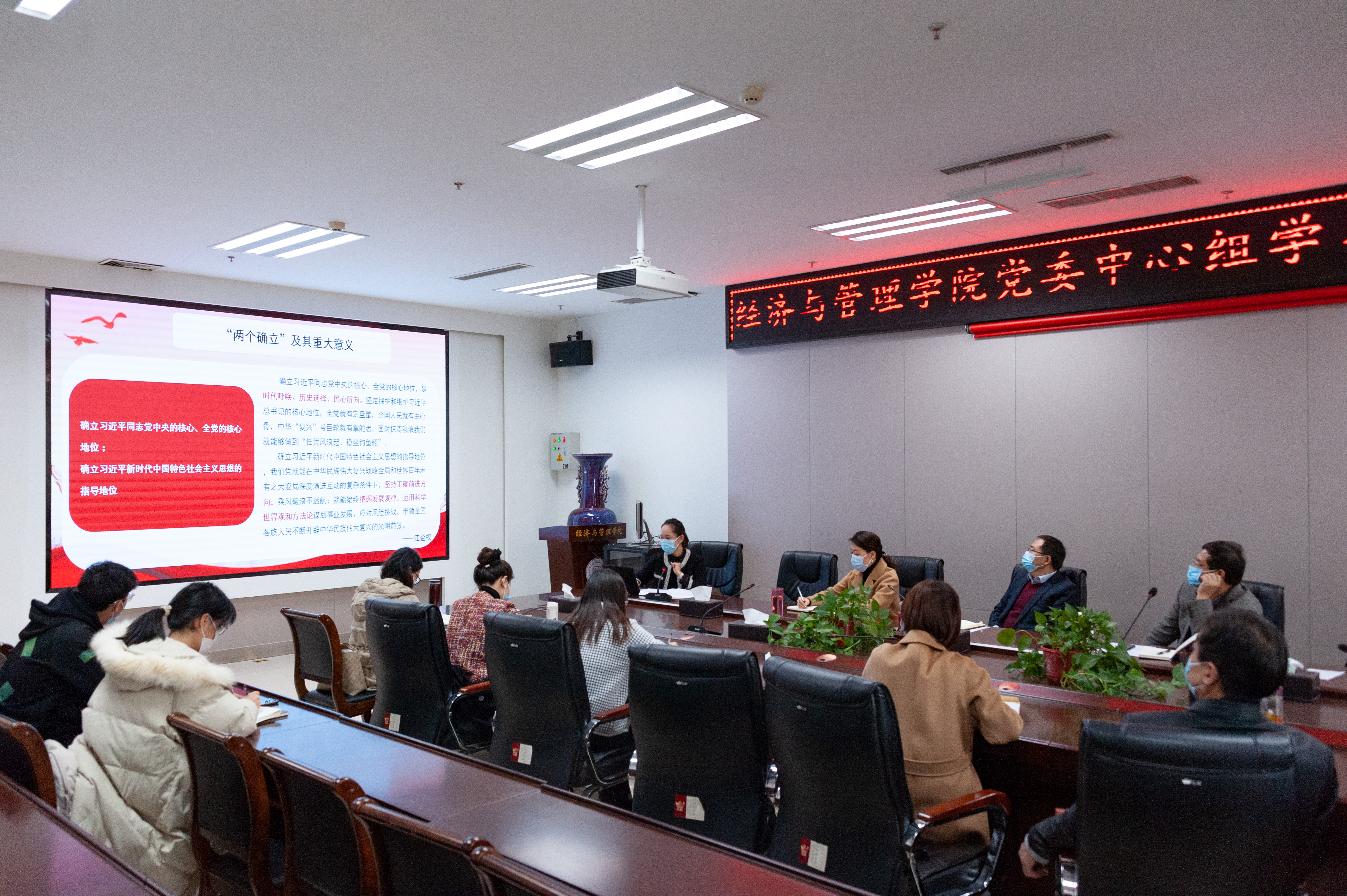 刘宁静首先与大家一起共同学习了《中国共产党十九届中央委员会第六次全体会议公报》原文,然后从“党的十九届六中全会召开的时间节点”谈起,并从“会议的主要内容、《决议》的主要精神以及原原本本学习会议精神”等方面系统解读了十九届六中全会的主要精神和重要意义。与会师生纷纷表示要以此会议为起点,认真学习贯彻好全会精神,坚定理想信念,牢记初心使命,提高“四个意识”,增强“四个自信”,自觉做到“两个维护”,努力为实现中华民族伟大复兴中国梦贡献力量。