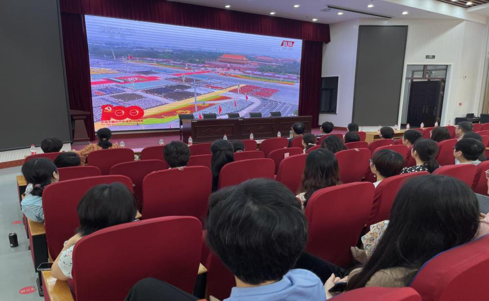领导班子组织全体教职工在教学楼AB间大教室1集中观看大会直播。