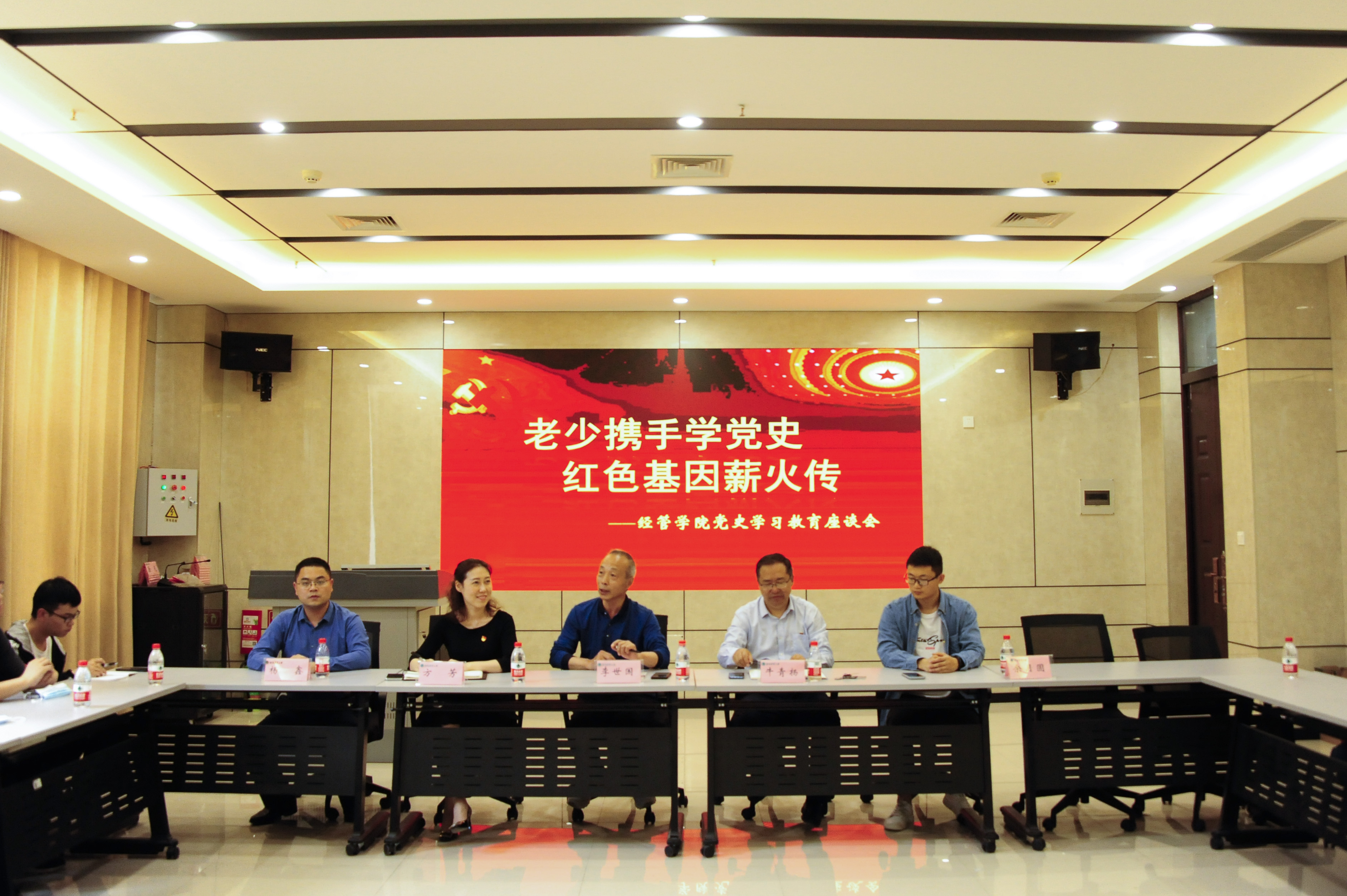 于教学楼B206会议室举办党史学习教育座谈会。校关工委副秘书长、校离退休职工工作处党委委员李世国、院党委书记牛青杨、党委副书记方芳、团委书记杨鑫和20级辅导员余月圆出席本次座谈会,威尼斯人App