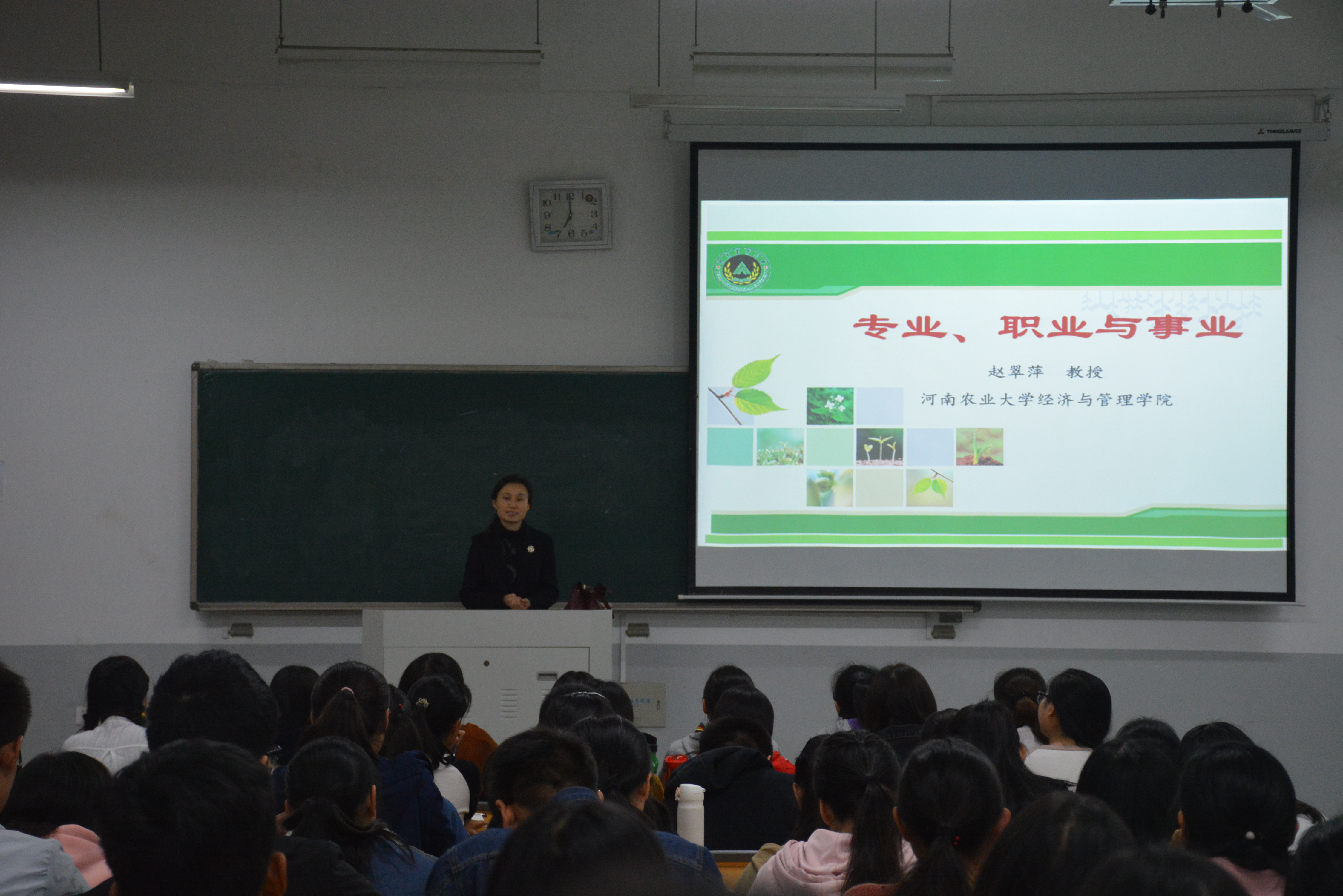 首先,副院长赵翠萍简单向同学们介绍了大学内的各个学科门类。她指出,农林经济管理专业是管理学学科下的一级学科,它将经济学、管理学的最新理论引入农业领域,主要研究如何对农业、渔业生产进行宏观调控以及如何促进国家农业经济的发展。接着,赵翠萍教授通过列举大量的图文资料解释了专业、职业和事业的区别和联系。她强调本科阶段的专业学习重在提升基本素养、思维方式和专业技能,为未来的职业及事业打下坚实的基础。随后,赵翠萍教授就如何对待专业学习等方面为同学们提供了几点建议。她希望同学们能认真对待本科阶段的专业学习,增强专业素养,实现自身的良好发展。现场同学认真听讲,气氛活跃。最后,此次专业导学讲座在同学们热烈的掌声中圆满地落下了帷幕。