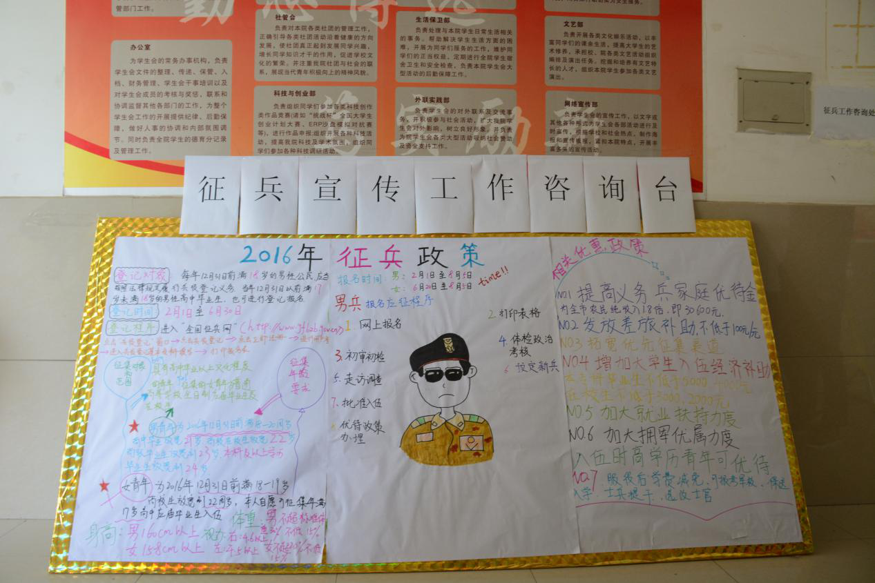 积极响应国家的大学生征兵政策,开展征兵宣传工作咨询活动。活动现场,院团委委员向前来咨询的学生讲解了军队现代化建设对高素质人才的需求、大学生服兵役的法律义务、国家的相关优惠政策,详细介绍了征兵政策的变化、入伍条件、时间安排、报名流程、服役待遇等问题,使同学们提前了解军营情况和部队对大学生入伍的各种优惠政策和优待条件,帮助同学们树立了从军报国的志向;同时,现场工作人员向前来咨询的学生发放征兵宣传单,鼓励大学生踊跃报名,接收祖国挑选,圆自己的从军梦。