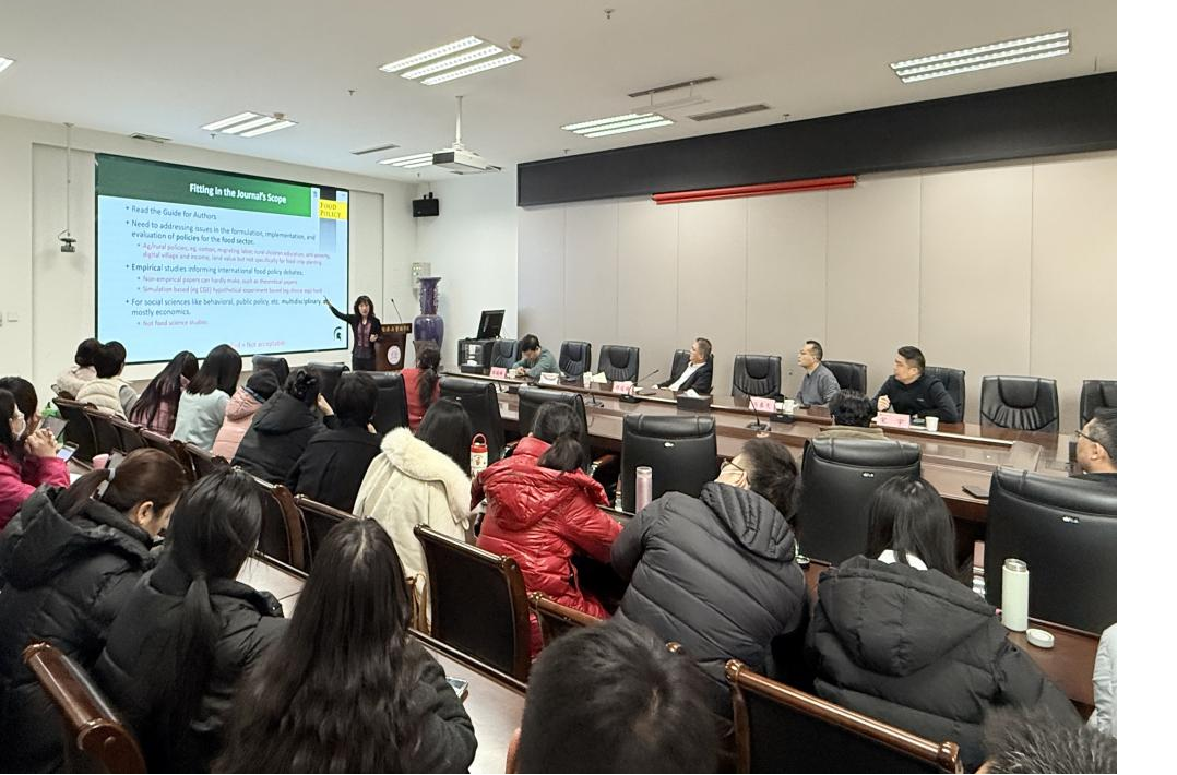 讲座中,Holly Wang教授以《Food Policy》期刊联合主编的身份,系统介绍了该刊的定位与特色。她指出,《Food Policy》聚焦食物生产、消费、产业链、资源环境及营养健康等领域的政策实证研究,重视研究的逻辑严谨性、数据透明度与英文写作规范性,并提醒研究者注意避免选题偏离期刊范围、政策建议缺乏深度等常见问题。随后,Holly Wang教授详细阐述了稿件从投稿、初审、外审到录用的全流程,分析了常见退稿原因,并鼓励师生积极参与审稿等学术服务,在贡献学界的同时提升自身学术能力。在交流环节,与会师生围绕期刊取向、研究方法、审稿周期、中英学术写作差异等踊跃提问,Holly Wang教授结合自身经验逐一予以细致解答。她勉励青年学者保持耐心、勇敢投稿,在反复打磨中不断进步。