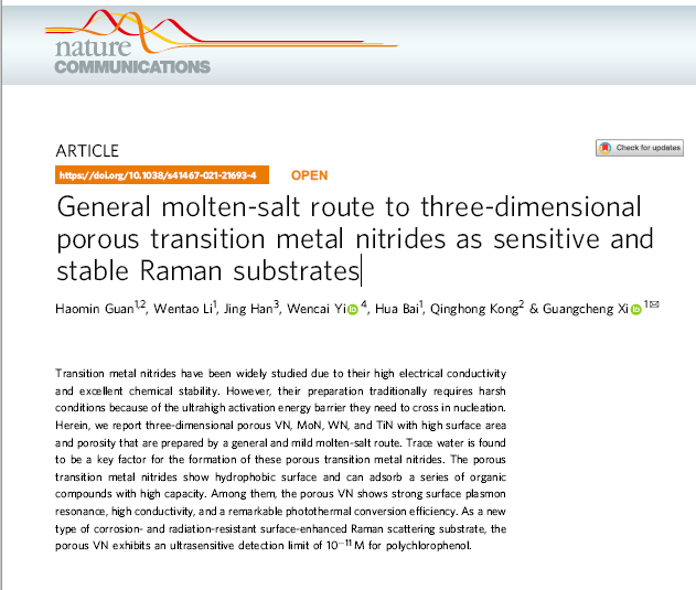 孔庆红副教授团队与中国质检局席广成研究员团队合作,在nature communications杂志上发表最新研究成果“General molten-salt route to three-dimensional porous transition metal nitrides as sensitive and stable Raman substrates”,论文的第一作者为威尼斯人app