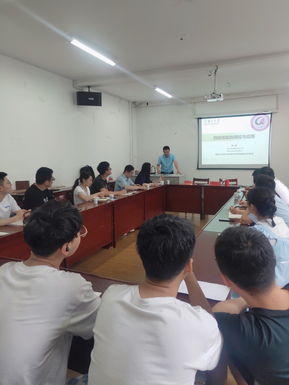 周老师以“四链核酸的调控与应用”为主题,介绍了四链核酸发现的重要意义,并结合自身的研究工作介绍了G-四链体/DNA酶在催化方面的应用及医学领域的潜在应用,这些工作都期待能为人类健康研究有贡献。报告结束后,周老师与在场师生进行了热烈的讨论,并详细地解答了相关老师和同学在科研上的困惑和问题。在座师生纷纷表示这是一场精彩而生动的学术报告,收获颇丰。
