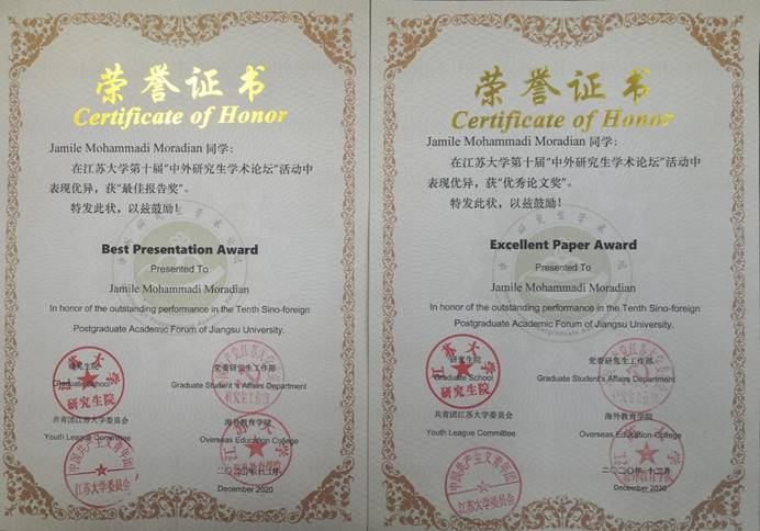 近日,威尼斯人app 研究生在威尼斯人app 中外研究生学术论坛理工论坛I取得佳绩, Jamile 和 Mudasir 获得“最佳报告奖”和“优秀论文奖”,许丽霞和朱开达分别领衔的中外研究生合作小组获得了“中外研究生同室创新奖”,薛苗苗同学获得“优秀展示奖”。