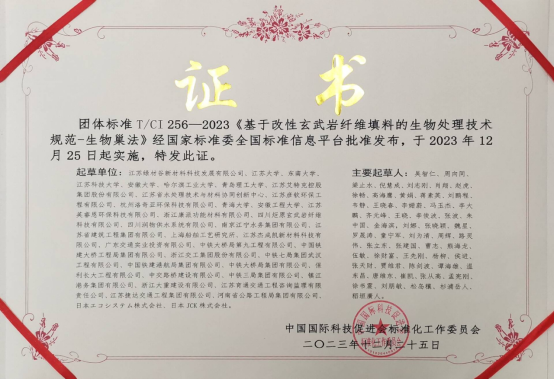 吴智仁教授主持、联合众多高校、企业联合编订的T/CI 256—2023《基于改性玄武岩纤维填料的生物处理技术规范-生物巢法》团体标准正式获批。经国家标准委全国标准信息公共服务平台核查,报批标准的内容和格式符合修改意见,平台同意该标准在2024年1月11日正式发布。