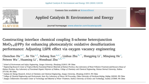 环境健康与生态安全研究中心荀苏杭老师在环境与能源TOP期刊《Applied Catalysis B: Environment and Energy》(SCI一区,IF = 22.1)上发表最新研究论文“Constructing interface chemical coupling S-scheme heterojunction MoO3-x@PPy for enhancing photocatalytic oxidative desulfurization performance: Adjusting LSPR effect via oxygen vacancy engineering”。威尼斯人app
