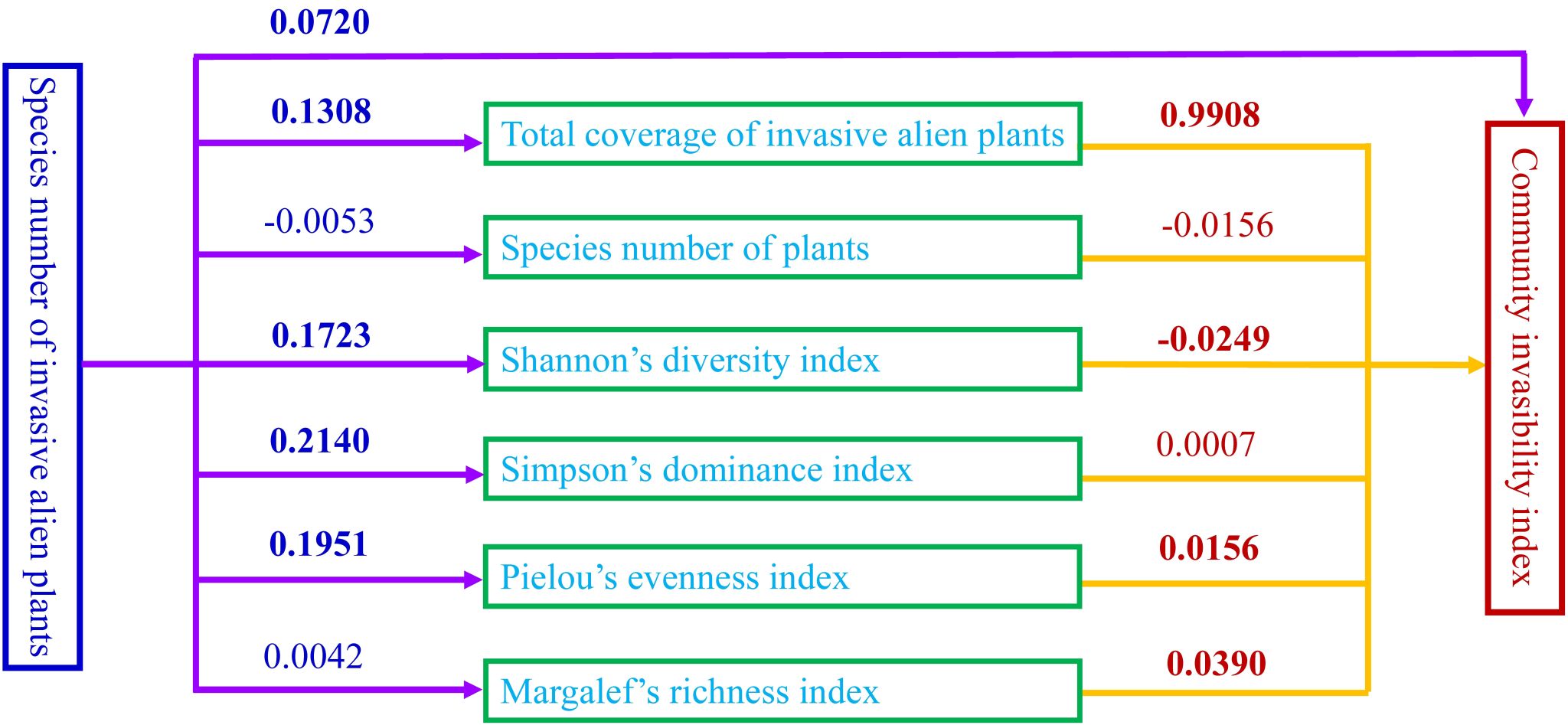 (5)入侵植物种类数量正向调控入侵植物总盖度、植物多样性、植物优势度、植物均匀度和群落可入侵性。