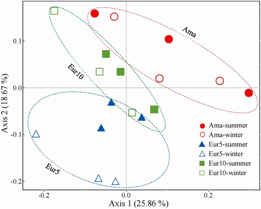 马占相思林在亚洲国家广泛分布,但近年来因根腐病和溃疡病的危害,正逐渐被桉树林取代。本研究对中国南方马占相思次生林以及由该林皆伐后改种的5年龄和10年龄的桉树林土壤中的原核生物进行了研究。通过对16S rRNA基因进行测序、对土壤理化因子的测量和分析。结果发现森林皆伐改造显著改变了土壤原核生物群落结构,而改造林经过多年恢复后,原核生物群落也经历了渐进的恢复。研究还发现,土壤pH值、含水率和总磷含量是影响土壤原核生物群落结构的关键理化因子。该研究成果得到了国家自然科学基金项目(32171760)的资助。全文链接:。