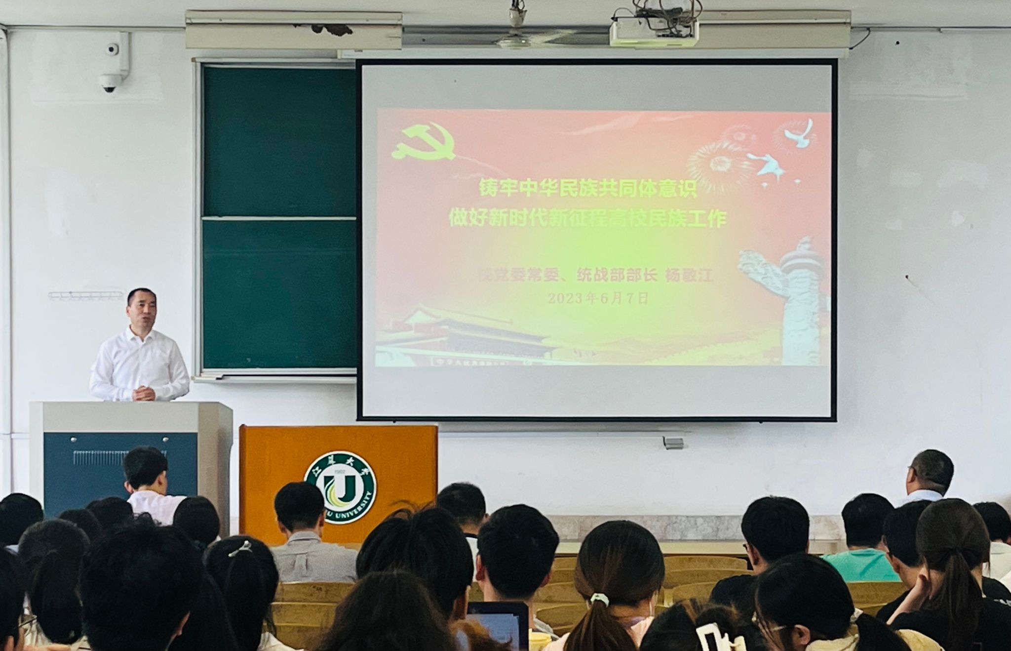 党委特邀校党委常委、统战部部长杨敬江作民族工作专题报告会,院长杜道林主持,威尼斯人app