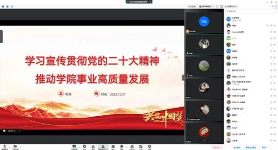 杨书记首先阐明党的二十大重大意义、大会主题和主要成果,从“深入学习领会新时代10年伟大变革的深远历史意义”等“十个深入学习领会”展开讲述。然后围绕党的二十大报告中关于“推动绿色发展,促进人与自然和谐共生”这一重要表述,阐明了广大环境工作者新时代的使命任务、战略方针和奋斗目标。最后,杨书记强调,党员干部要坚定使命担当,争做党的二十大精神的坚定信仰者、有力传播者、忠实践行者,牢牢把握立德树人的根本任务,始终坚持为党育人、为国育才,坚持以学生发展为中心,坚持厚植学生情怀,坚持问题导向,坚持率先垂范,坚持健康发展、可持续发展。
