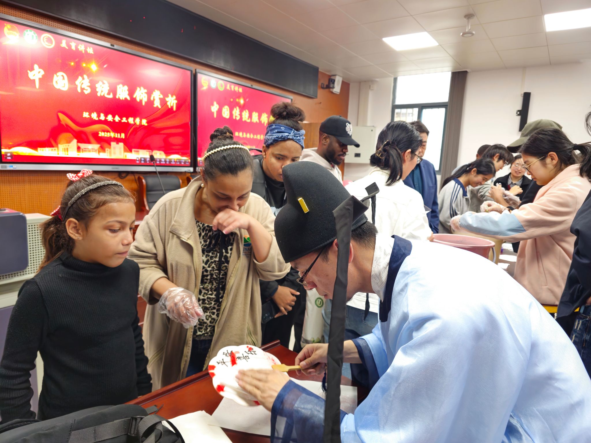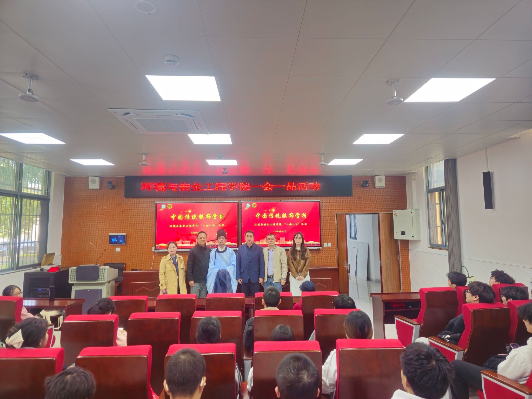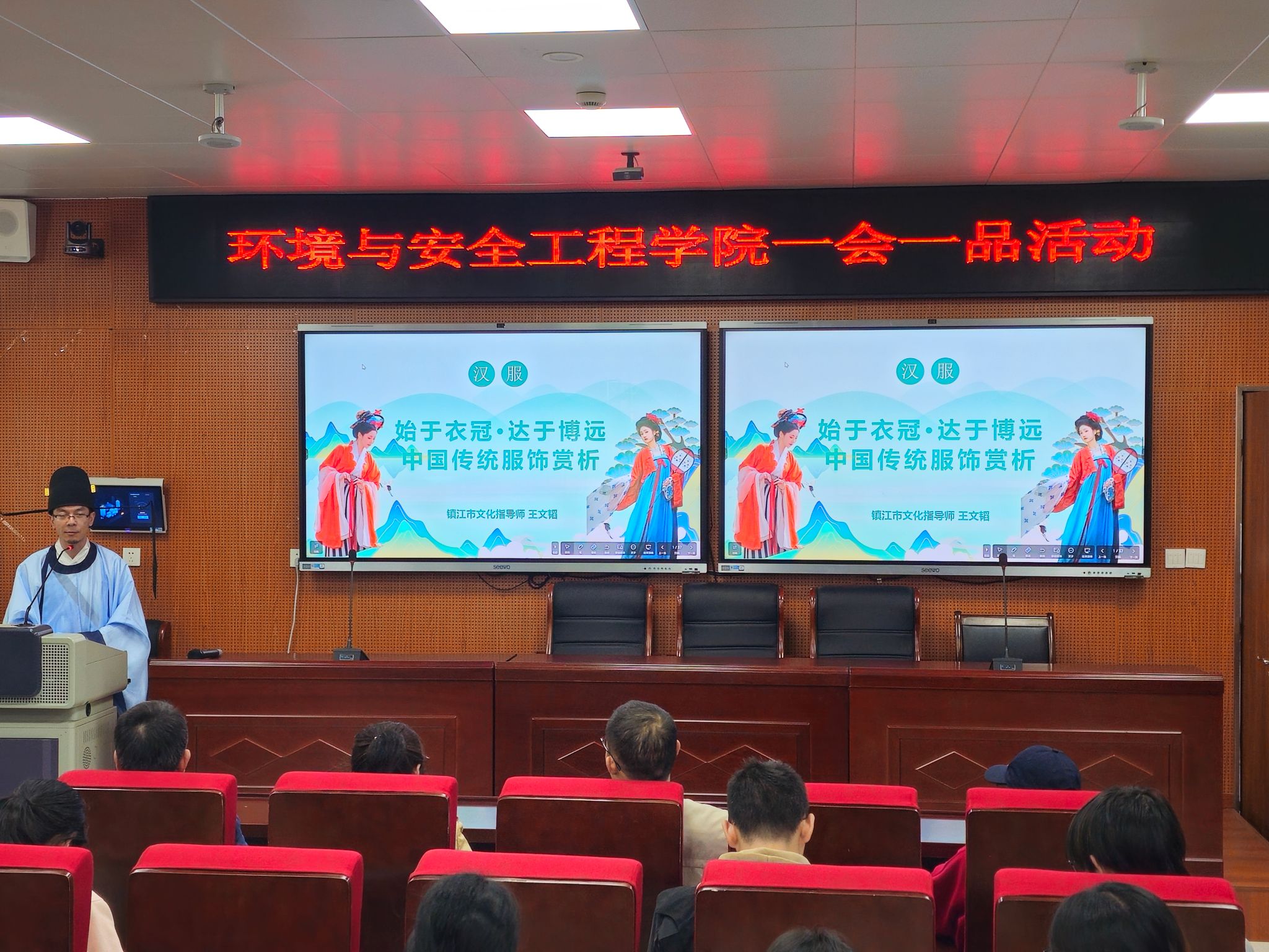 楼118报告厅举办“始于衣冠,达于博远——中国传统服饰赏析”美育讲坛,本次活动邀请到江苏吉藏文化创意产业发展有限公司总经理王文韬担任主讲人。活动由工会主席郑敏学主持,90余名中外学生参加了活动。