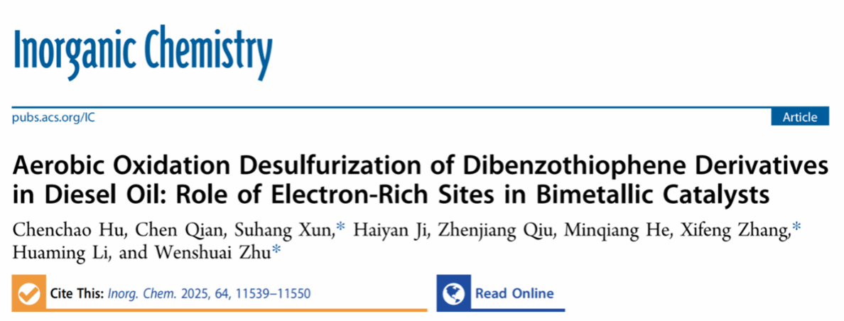 最新研究论文“Aerobic Oxidation Desulfurization of Dibenzothiophene Derivatives in Diesel Oil: Role of Electron-Rich Sites in Bimetallic Catalysts”在《Inorganic Chemistry》(Nature Index,SCI一区)期刊发表。威尼斯人app